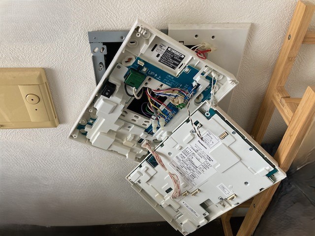 該当の居室内にてインターホンを取り外し、断線の原因を調べています。